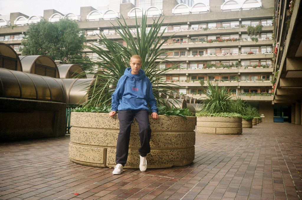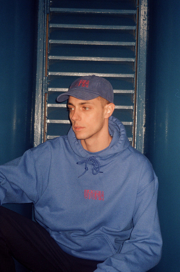 This hoodie from the Blue Utopia collection features an embroidery with the text 'Utopia' on the front as well as label detailing on the hem Everything from the collection has been designed and printed in our South East London studio.